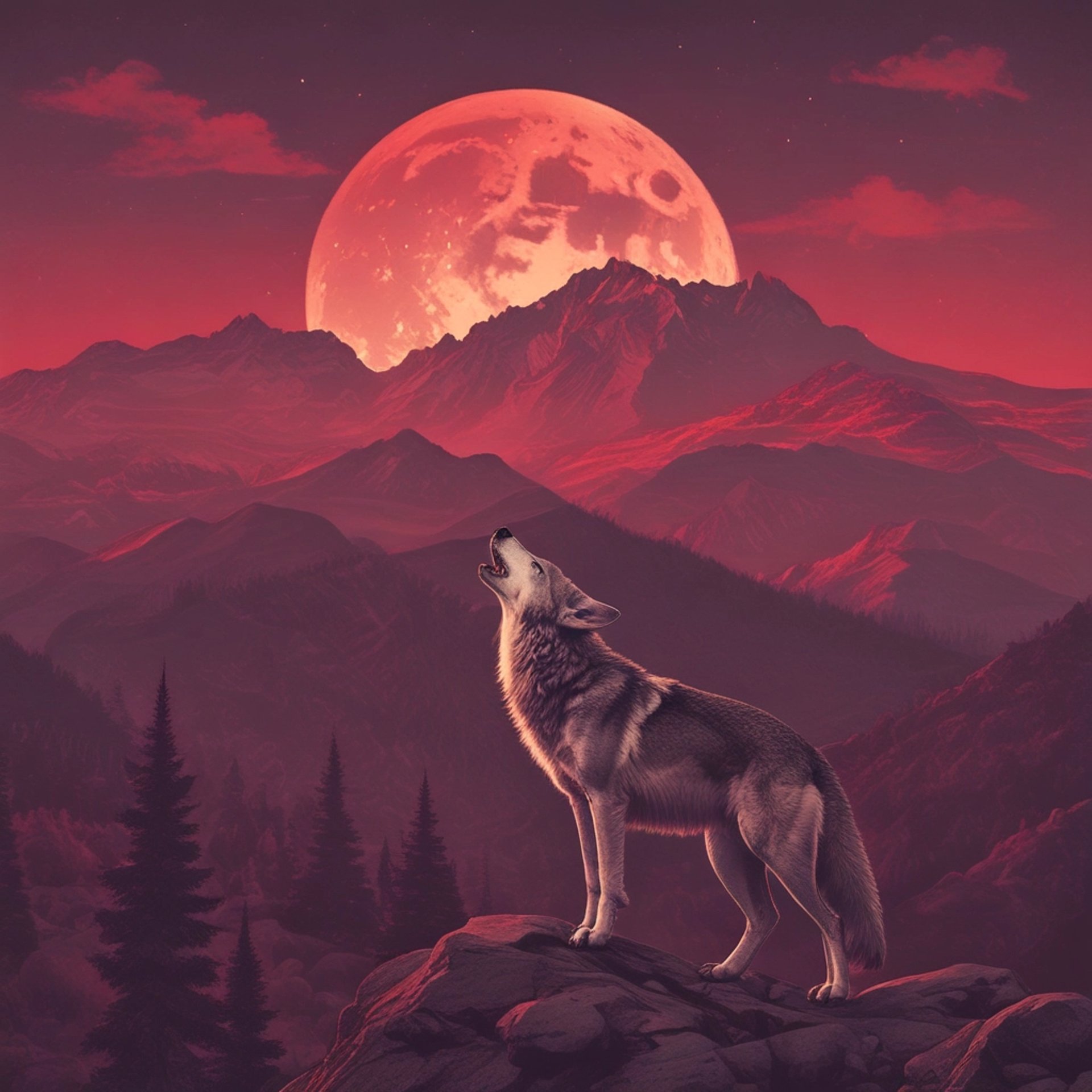 Shadows dance in gray, black, and red hues.